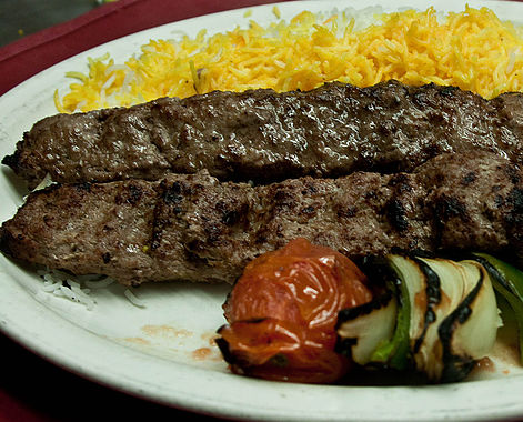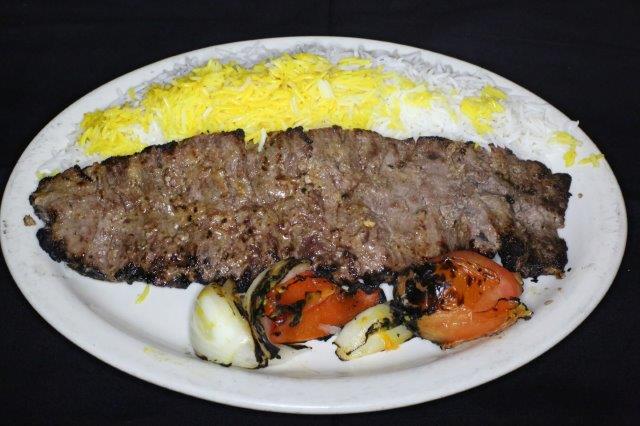 (Ground beef kabob) A tantalizing mixture of ground beef and onions. Skewered and broiled. Served with broiled tomato and basmati rice.