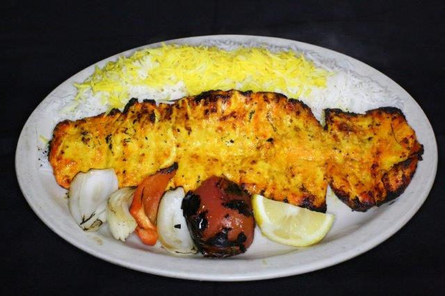 Breast of chicken sliced skewered marinated and broiled. Served with broiled tomato, seasinal vegetables and basmati rice