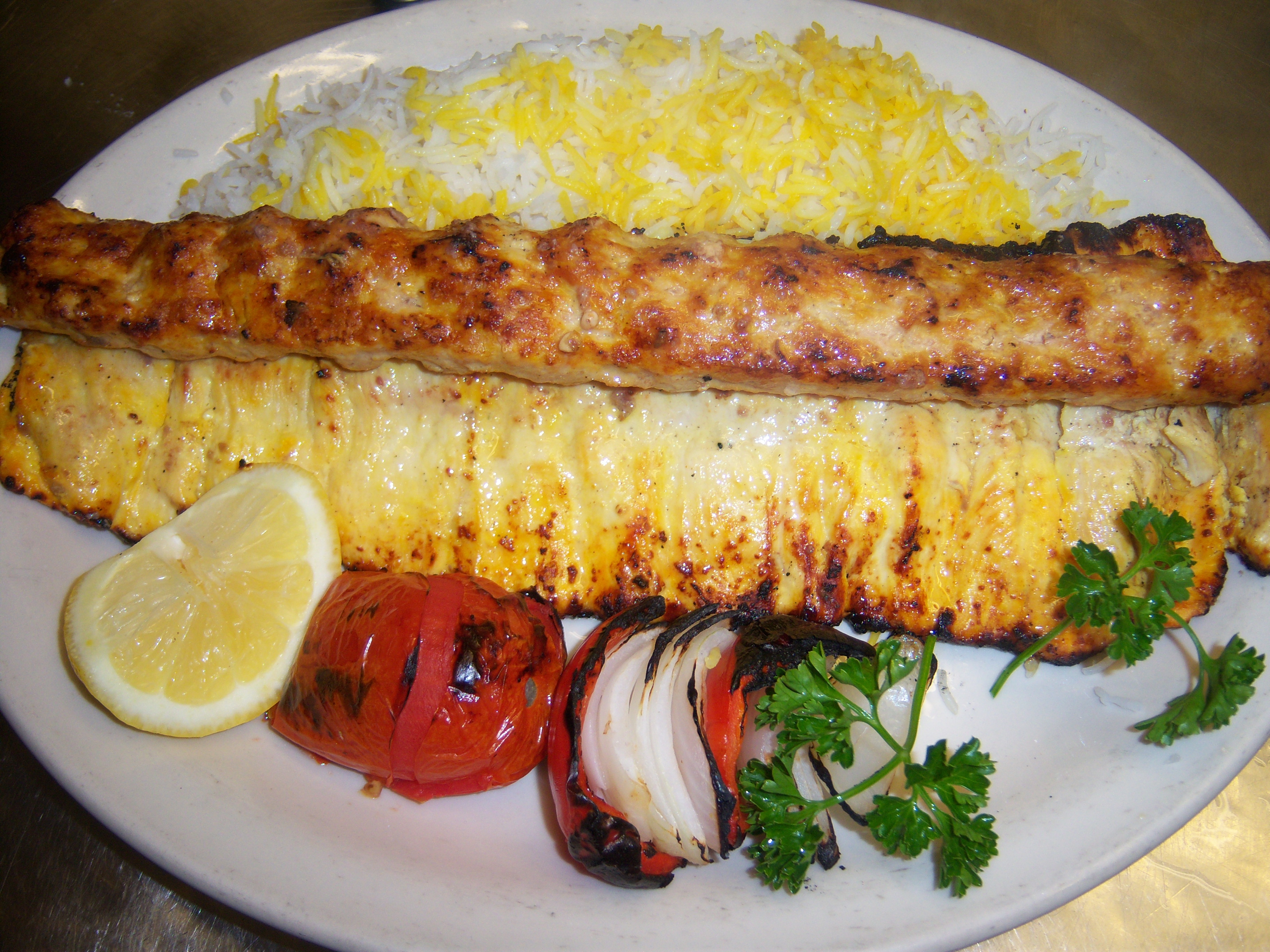 Combination of chicken barg and chicken koobideh. Served with broiled tomato, seasonal vegetables and basmati rice.