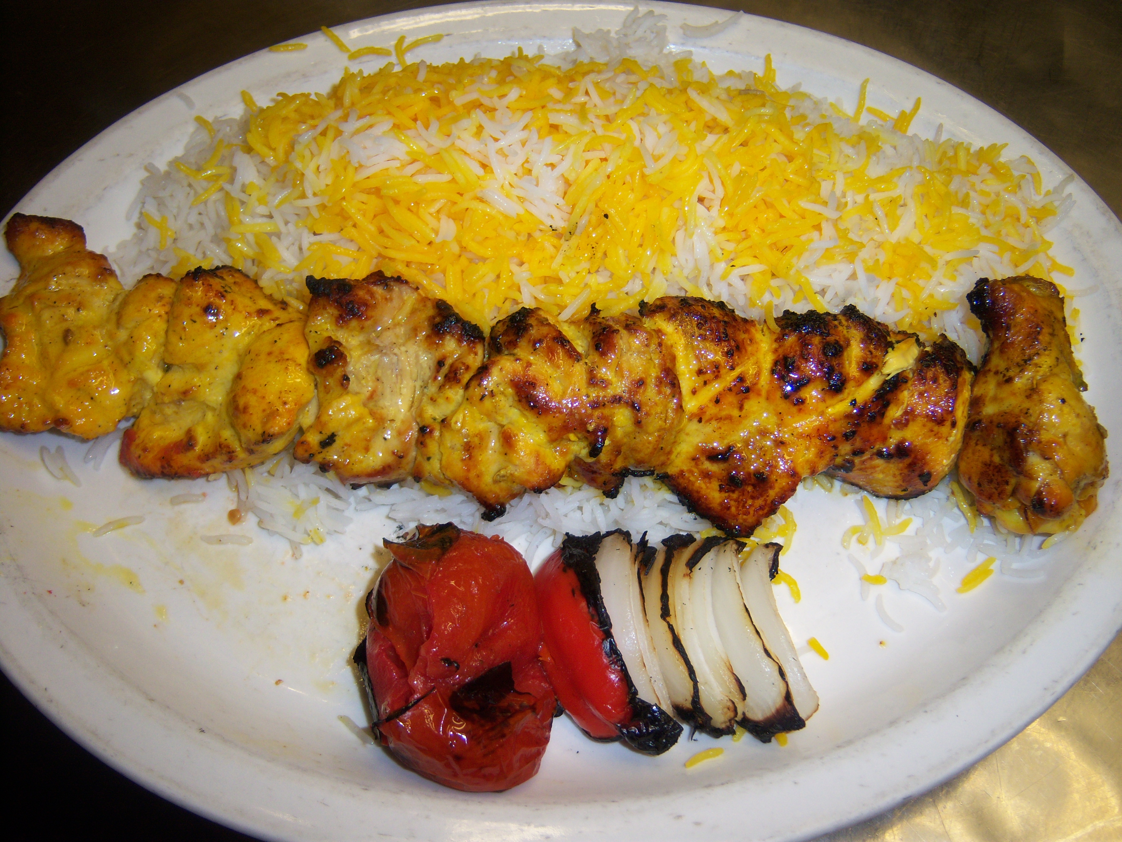 Heart of tenderioin sliced skewered marinated and broiled. Served with broiled tomato, vegetables and basmati rice.