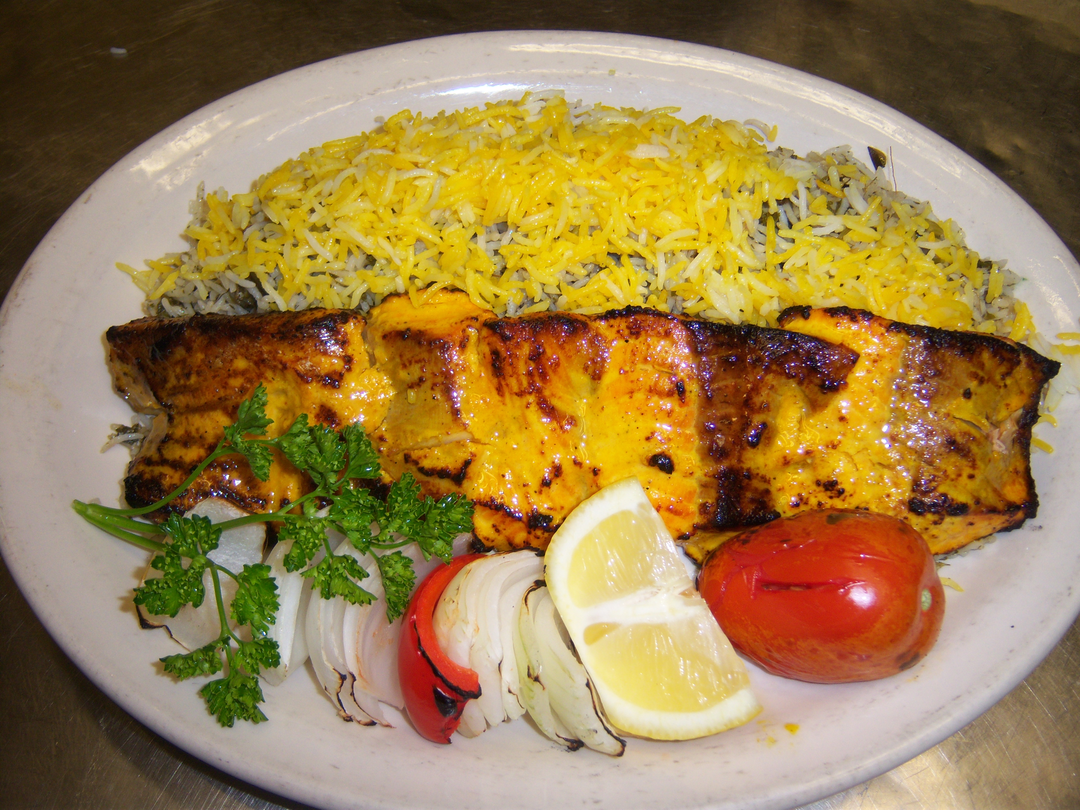 Daily fresh fish marinated and broiled with a skewer of whole tomato and seasonal vegetables, Served with green salad and sabzipolo rice