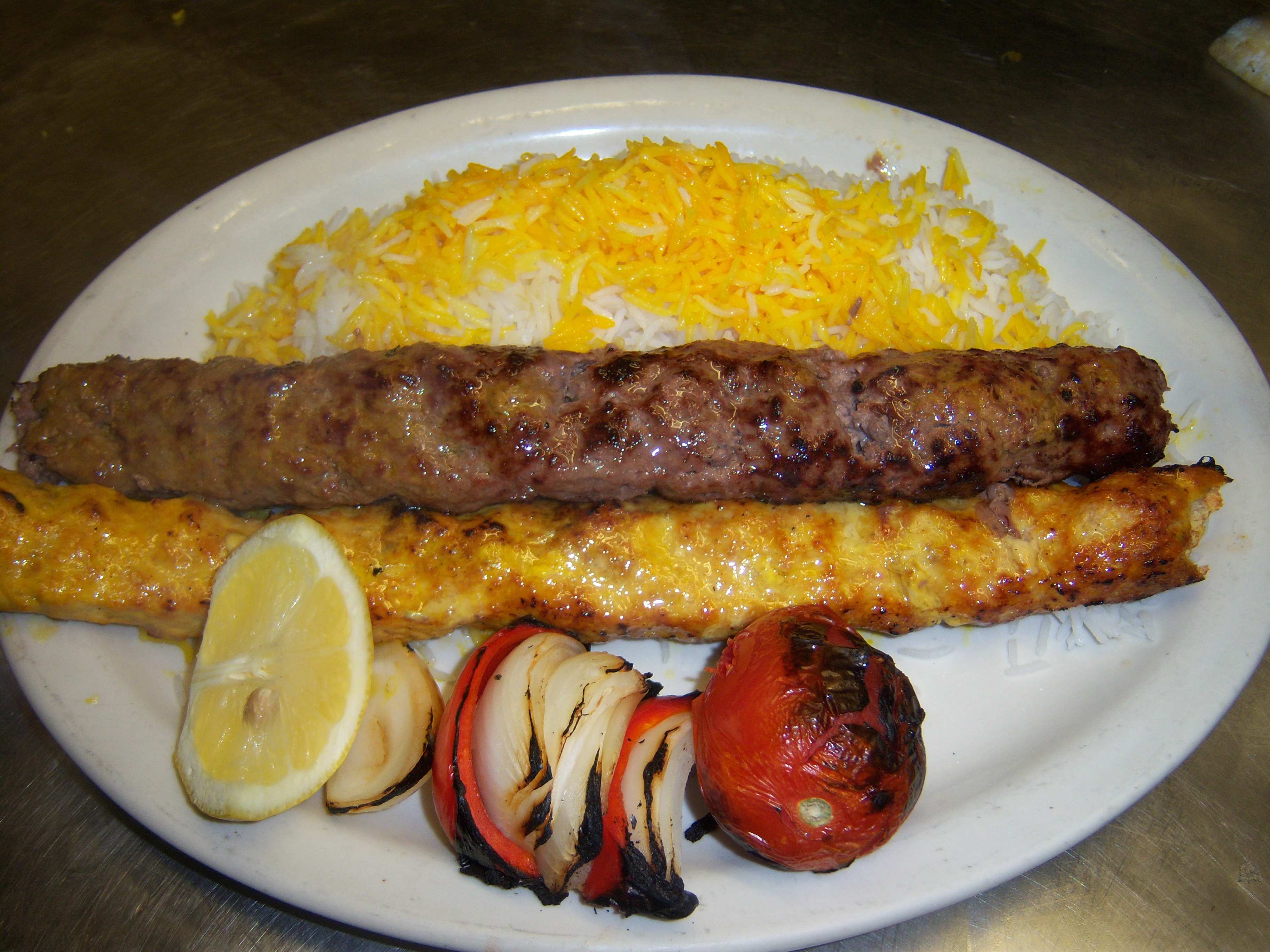 Combination of barg and koobideh. Served with broiled tomato, vegetables and basmati rice.